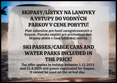 Galeria Thermal Bešeňová **** is situated directly in the Bešeňová Water Park, where you can enjoy swimming in the thermal pools all year round. The hotel offers access to the private thermal pools, directly from selected rooms. The pools are available from 9:00 till 21:00. Modern and bright rooms with a balcony feature views to the surrounding mountains. Each room features an easy free access to the private thermal zone with over 380 m2 of pools. The thermal zone offers streams with water temperature from 30 to 38°C, as well as a terrace with a lobby bar. Other facilities provided for the guests include a wellness bag with a bathrobe and a towel, a 24-hourshours front desk and a lobby bar with a library. Guests have all-day Bešeňová water park access (number of tickets = number of nights, can be used on the arrival day or the departure day) with many pools, toboggans and other water attractions. Buffet breakfast is served in the Panorama restaurant, situated nearby. There are other 3 restaurants located in the water park area, where you can enjoy lunch or dinner. Ski passes/cable cars and water parks included in the price. The offer applies to guests registrated for Gopass. It cannot be used on the arrival day (check-in) and the number of tickets corresponds to the number of nights spent at the accommodation establishment.. Ski passes are valid during the ski season. Every ticket is non-transferable.